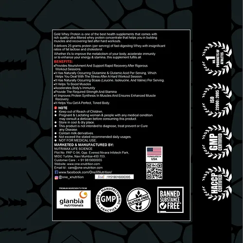 One-X Nutrition Gold Whey Protein is a high-quality health supplement designed to help you build muscle and recover quickly after intense workouts. It is formulated with ultra-filtered whey protein concentrate, which is known for its ability to promote muscle growth and repair. This protein supplement delivers 25 grams of fast-digesting whey protein per serving, providing your body with the essential nutrients it needs to recover after a hard workout.